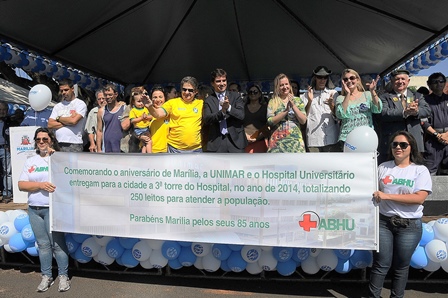Pela primeira vez funcionrios da Associao Beneficente Hospital Universitrio (ABHU) de Marlia participaram do desfile cvico comemorativo ao aniversrio da cidade, que completou no ltimo dia quatro, 85 anos de emancipao poltico-administrativo, sendo, inclusive, feriado municipal. Foi uma forma simples de participar das festividades, afinal de contas, o hospital faz parte da histria e do dia a dia da cidade, comentou Mrcia Mesquita Serva Reis, superintendente da ABHU de Marlia. Inclusive, fizemos uma entrega simblica, ao Prefeito Vinicius, das chaves do novo prdio que inauguraremos at o ms de junho, comentou a dirigente hospitalar que agradeceu o grupo de mais de 50 funcionrios que estiveram presentes na festividade da ltima sexta-feira. Literalmente eles vestiram a camisa do hospital, brincou ao v-los todos uniformizados.