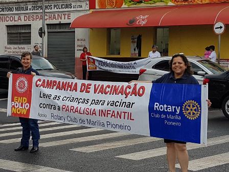 O Rotary Club de Marlia-Pioneiro, no Distrito 4510 do Rotary International, na regio centro oeste do interior do Estado de So Paulo, promoveu duas atividades em favor da campanha mundial contra a paralisia infantil, promovida pela organizao mundial, celebrada sempre no dia 24 de outubro, nos 219 pases onde est presente. Participamos de duas palestras sobre o tema e expusemos faixas alusivas a campanha no centro da cidade, comentou a presidente do clube rotrio mariliense, a advogada Angela Ceclia Giovanetti Teixeira, que convocou o clube a participar das duas aes realizadas nos ltimos dias. Fizemos um trabalho de conscientizao, reforou a dirigente que registrou as aes no portal da campanha, como forma de fortalecer e mensurar o trabalho mundial.