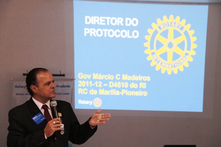 O convidado para expor a funo foi o jornalista Mrcio Cavalca Medeiros, associado do Rotary Club de Marlia-Pioneiro, atual Diretor do Protocolo do Governador do Rotary, do Distrito 4510 do Rotary International, o meteorologista, Maurcio de Agostinho Antnio, associado do Rotary Club de Bauru-Terra Branca. Existe uma confuso muito grande entre as funes de cerimonialista e Diretor do Protocolo, afirmou o rotariano mariliense que est visitando clubes e distritos rotrios para debater o assunto. Por isso pouco material oficial do Rotary sobre a funo, justificou ao lembrar da existncia de uma srie de publicaes com autores rotrios dos mais diversos, mas que no so oficiais do Rotary International. Nem manual especfico do Diretor do Protocolo existe oficialmente, apontou Mrcio Cavalca Medeiros.