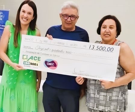 Giuciane Figueiredo, do Cmec entrega o cheque com a doao de R$ 13.500,00 para Silvia Mendona da ACC |
