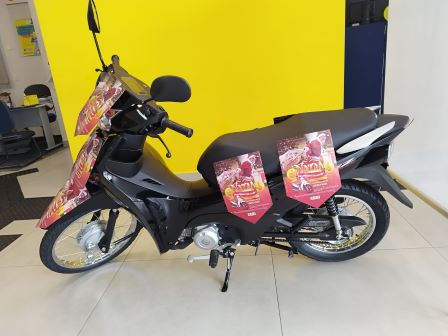 Motocicleta de 125cc ser sorteada entre os consumidores da cidade de Quintana, em evento no centro comercial no calado |