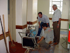 Os engenheiros Rangel Pietraroia Filho e Paulo Csar Lapa esto coordenando alguns trabalhos contratados pelo hospital recentemente, no sentido de promoverem reforo de fundaes no Centro Cirrgico e a ampliao do setor de hemodilise. So aproximadamente 200 estacas no total, disse Paulo Csar Lapa que desenvolveu uma logstica especial para a execuo da obra que requer dias, horrios e formas especiais para serem realizadas, pois o servio depende de mdicos, pacientes e cirurgias, que no podem ser canceladas, adiadas ou suspensas. um trabalho diferente por serem prdios distintos, em situaes complexas, sem contar o efeito surpresa que sempre acontece, comentou Rangel Pietraroia Filho.